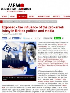 In 2009, when Channel 4’s Dispatches aired a programme about pro-Israel lobby groups, MEMO illustrated their article about the programme with this image that implies Jewish or Israeli financial influence over the UK Parliament: