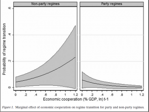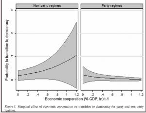 …column 3 [of table not shown] estimates how Economic cooperation affects regime durability if only transitions to democracy are considered (as opposed to no regime transition). Interestingly, as column 3 indicates, the direction of the unconditioned effect of Economic cooperation on transition to democracy is positive – that is, increasing the risk for democratic transition. However, as Figure 3 shows, this effect is significant only for non-party regimes and only for Economic cooperation between 0.2 and 0.7 per cent of GDP.