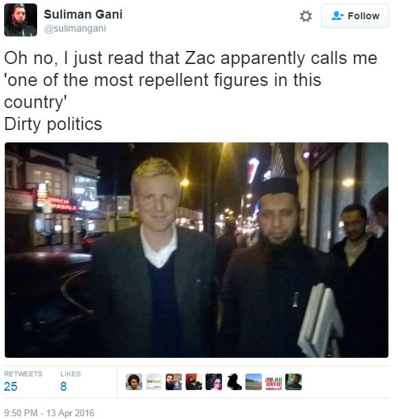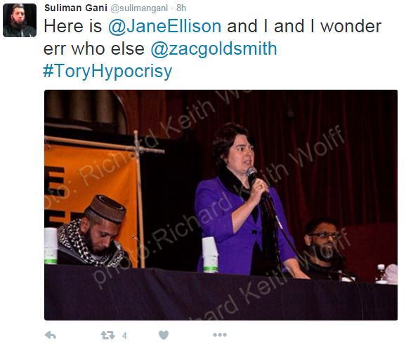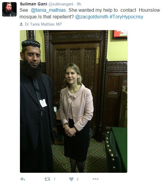 The hate preacher and campaigner for jihadist convicts and for a boycott of Ahmadi shops, Suiliman Gani/Ghani sprung into action last night, posting a series of photographs of him in the company with Tory politicians.