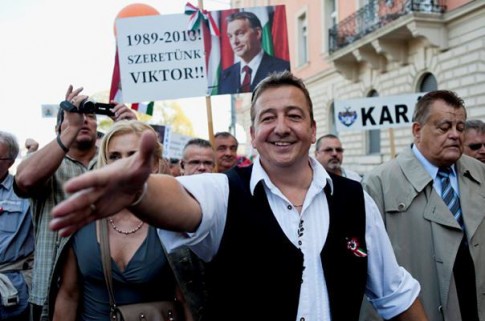 Zsolt Bayer, leading the Peace March in Hungarian Guard uniform