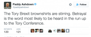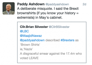 His subsequent explanation for comparing Conservative Brexiters to Nazis was pretty feeble. He excused it as a metaphor and then explained that brownshirts was essentially a synonym for extremists. Calling any group ‘brownshirts’ is always a metaphor in the sense that it’s not literally true. However it’s clearly a far more charged word than ‘extremists’ (not that extremist seems the mot juste for the average Tory Brexiter) and unambiguously invokes Nazism. Insisting that he was only referring to the Brexiters in May’s cabinet, not the entire group didn’t help much either: