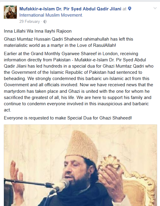 The statement which has been endorsed by senior Barelvi leaders such as Professor Saeed Shah Kazmi, Allama Syed Riaz Hussain Shah, Syed Shah Turabul Haq Qadri and Hajji Mohammad Tayyab calls the assassin Mumtaz Hussain Qadri ‘Ashiqe Rasool Ghaziye Mulk (Lover of the Prophet, Commander of the Country)’.