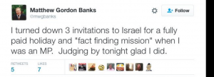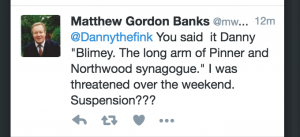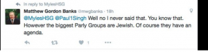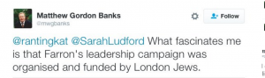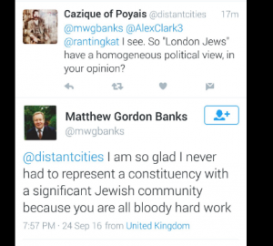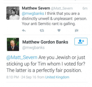 The first response to Cazique of Poyais is just extraordinary, even leaving aside the fact that I’m not sure Banks had any reason to assume s/he was Jewish. In his next response, to Matthew Severn, he asserts that only non-Jews are capable of making any valid criticism of his remarks.  Similarly, his comment to Daniel Finkelstein suggests that any repercussions he may face are a function of Jewish (and implicitly illegitimate) influence. Etc. The Jewish Chronicle has more here.