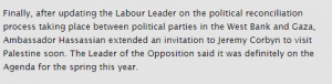 After briefing Corbyn personally the erstwhile PA ambassador to the UK Manuel Hassassian promptly boasted of the meet on the Palestine Mission website.
