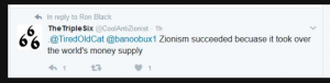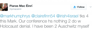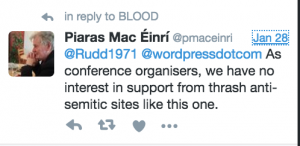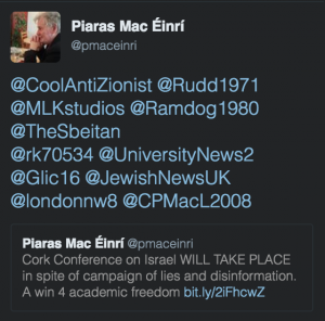 But – why on earth did he think these were appropriate people to be alerted to his academic conference on Israel? In the case of one of these accounts, it really does seem to have been simply careless, as his only previous interaction had been to chide them for an linking to an antisemitic site.