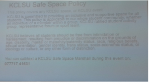 KCLSU believes all students should be free from intimidation or harassment, resulting from prejudice or discrimination on the grounds of age, disability, marital or maternity/paternity status, race, religious beliefs, sexual orientation, gender identity, trans staus, socio-economic status, or ideology or culture, or any other form of distinction. You can call/text a KCLSU Safe Space Marshall during this event on 077717 41631’