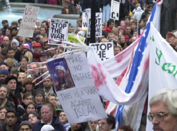 Note the sign of Osama bin Laden’s face and words “Make no mistake this is a war against Islam”