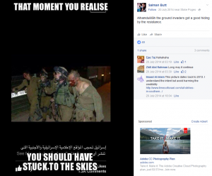 So what’s this then? Why, it’s Mr Butt supporting Hamas. Posting a picture of a bloodied IDF soldier, he writes: