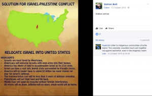 And here is his Middle East peace plan – move Israel to the United States. This is of course the image that got Labour MP Naz Shah in so much trouble.