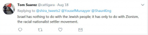 Here is a ‘tweet’ that perfectly shows it: The propagation of malicious falsehoods about Israel has become an industry. This book is Suarez’s job application, alongside such revisionist luminaries such as Pappé, Massad, Brenner, Finkelstein and Chomsky.