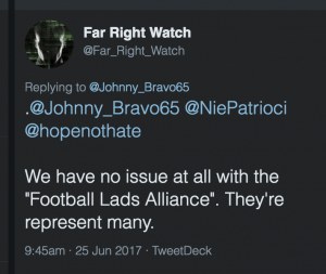 [Edit: ‘Far Right Watch’ has in fact modified their view of FLA since that tweet, and now sees more evidence (both on social media and the ground) that they are attracting EDL and Britain First type followers.]
