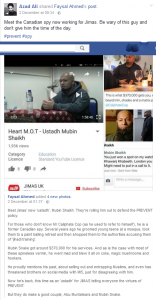 For Azad Ali, MEND’s “National Community Head”, this work was reprehensible. In 2016, Ali warned his Facebook followers to “be wary” of Shaikh, adding “don’t even give him the time of day”. This was Ali’s introduction to a post by a fellow extremist which denigrated Shaikh as a “snake” and “spineless vermin”. Jimas and Abu Muntasir were also attacked in the post.