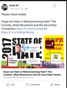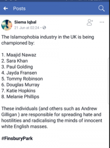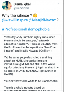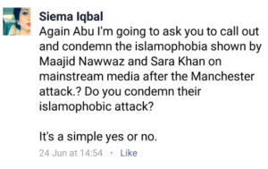 Lower and lower they go. In this post, Manchester MEND activist Siema Iqbal accuses Sara Khan of “Islamophobia” (no really, look) and even brackets her with former EDL leader Tommy Robinson and Paul Golding of Britain First: