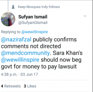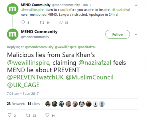 Turn to Sara Khan of Inspire. She and her group do excellent work against extremism, especially for Muslim women. So MEND hurl insults and threats at her, repeatedly. Here is one example combining both – she is told to “learn to read” and threatened with lawfare harassment.