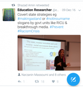 MEND is fond of saying Inspire along with other groups are actually the products of a sinister and covert state operation. The aim is to spread mistrust and increase anger among British Muslims. Here Shazad Amin, MEND’s current CEO, retweets a typical attack: