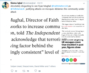 In another telling episode, in October 2017 Siema Iqbal launched a scurrilous attack on Fiyaz Mughal. She made the simultaneously ludicrous and dangerous charge that he justifies attacks on mosques: