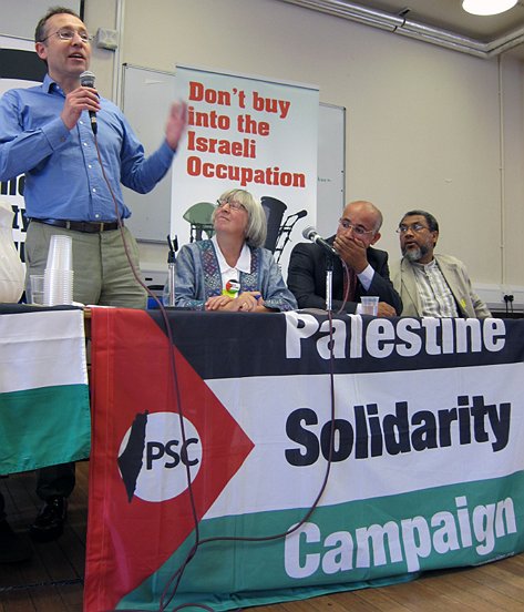Slaughter is very keen on the antisemitic rabble known as the Palestine Solidarity Campaign (PSC), another organiser of Friday’s demonstration. Here he is at a PSC meeting, sharing the platform with the disgraced Islamist Daud Abdullah (on the right).