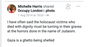 Michelle Harris has been shortlisted to stand as the Labour candidate in Amber Rudd’s (very marginal) seat of Hastings and Rye.  Her previous form with regard to antisemitism was revealed a few days ago by @GnasherJew, an account dedicated to exposing Labour antisemitism.  One particularly egregious moment came in 2014 when she shared a David Icke post referring to ‘Rothschild Zionist Israel’.  Here’s another example, also from 2014.