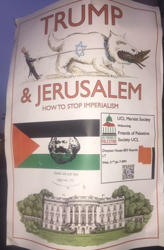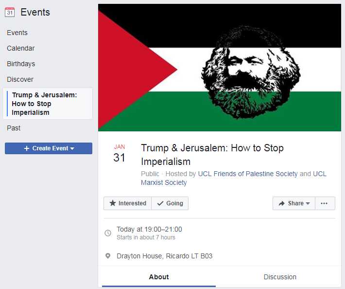 Bizarrely the UCL Marxist society uses an image that bears no relation to the event it’s ostensibly advertising; Trump and Jerusalem: How to Stop Imperialism: