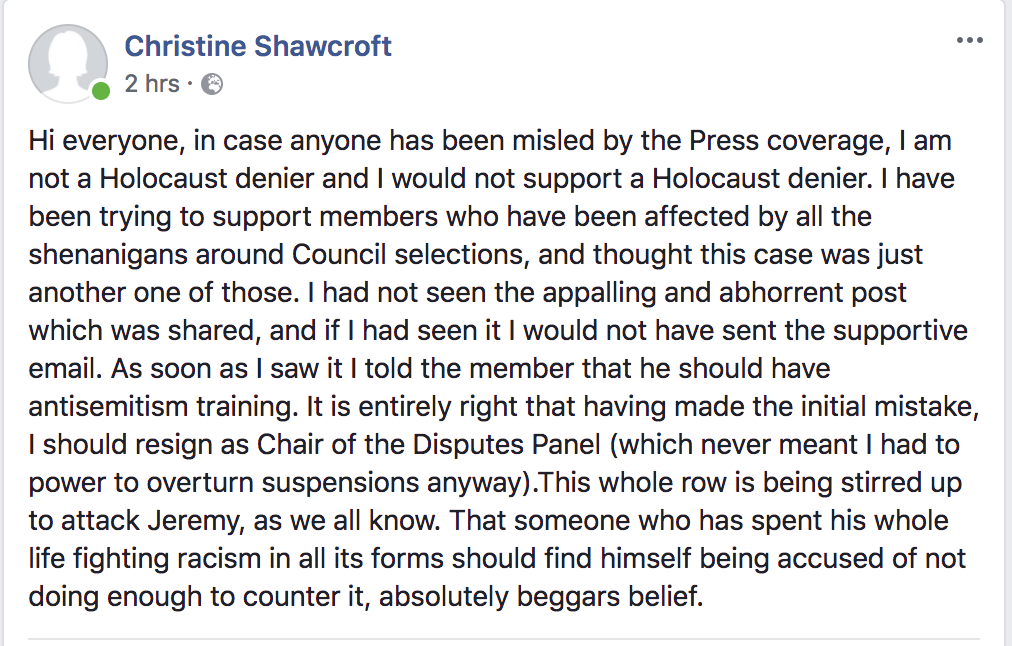So Christine Shawcroft was the short lived chair of Labour’s Internal Disputes Committee has put out a statement on Facebook explaining her actions;