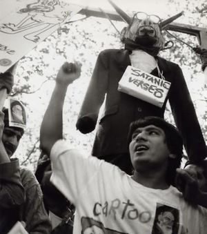 An effigy of Rushdie hanging from gallows was thrust into the air.