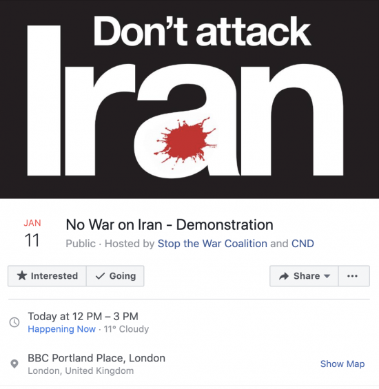 The protest against Suleimani’s killing in London is pro-Iranian regime, not pro-peace. Not one word condemning Tehran shooting down a civilian airline or Iranian missile strikes. Corbyn speaking later. pic.twitter.com/mUeEOS5gEF