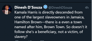 D’Souza’s assertion derives from an account of the Harris family history given by Kamala Harris’s father, Donald Harris – you can read the relevant passage in full here. Some have described his claims as ‘boasting’, but the tone of his account seems neutral to me.